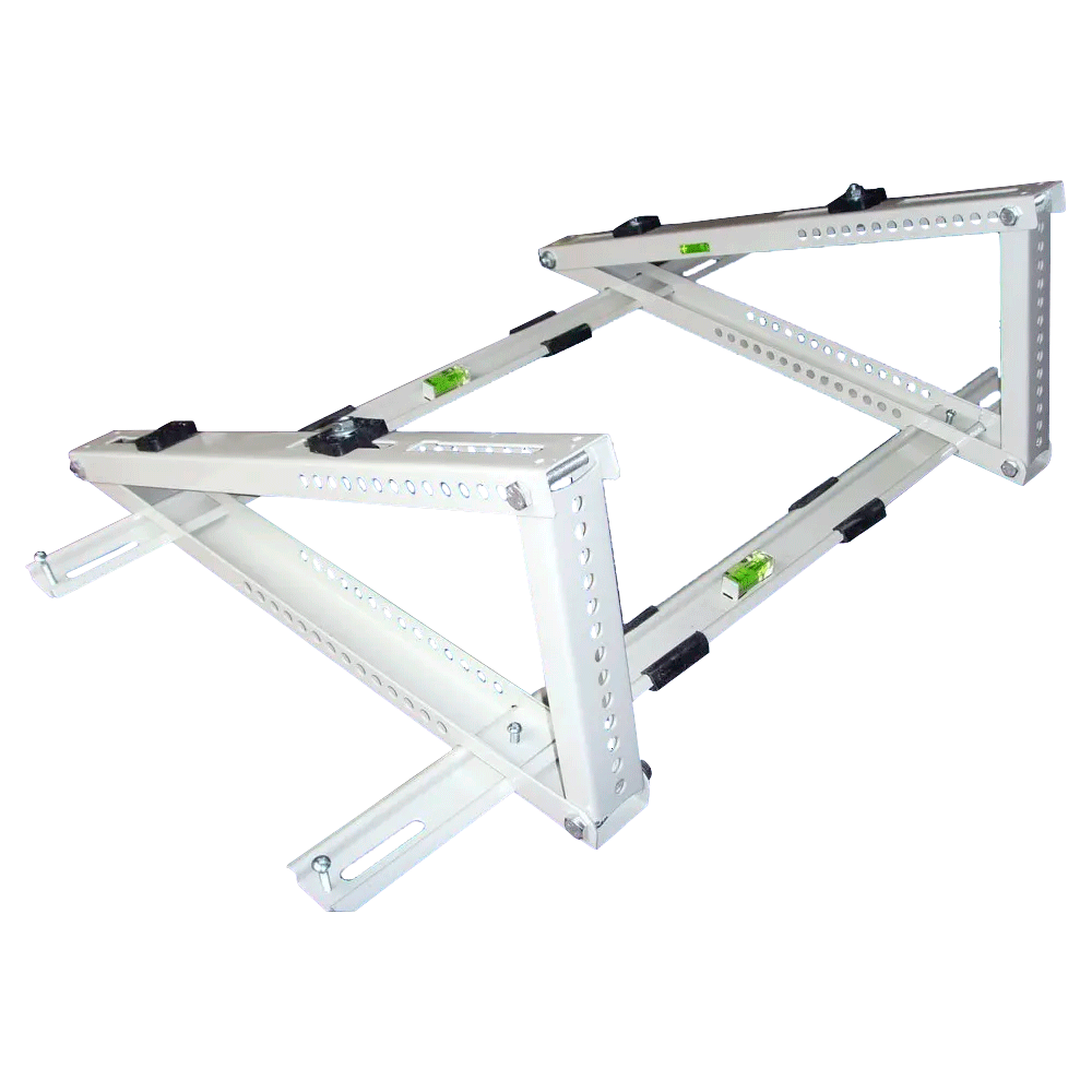 Fabricado en acero laminado en frío y pintado con plástico en polvo. Con nivel de burbuja y almohadillas de goma antideslizantes. Con amortiguador de goma y kits de instalación. Se utiliza para apoyar la unidad exterior del aire acondicionado en el techo declinado. Larga vida útil.